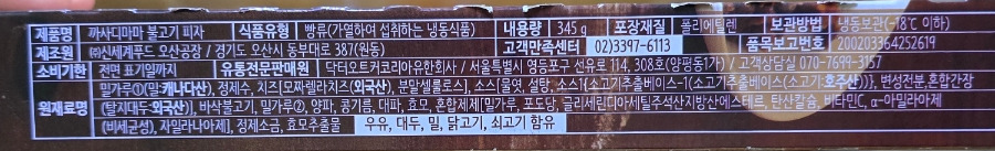 밀가루1(밀:캐나다산),정제수,치즈[모짜렐라치즈(외국산),분말셀룰로스],소스[물엿,설탕,소스1{소고기추출베이스-1(소고기추출베이스(소고기:호주산))},변성전분,혼합간장(탈지대두:외국산)],바싹불고기,밀가루2,양파,콩기름,대파,효모,혼합제제[밀가루,포도당,글리세린디아세틸주석산지방산에스테르,탄산칼슘,비타민C,a-아밀라아제(비세균성),자일라나아제],정제소금,효모추출물 |