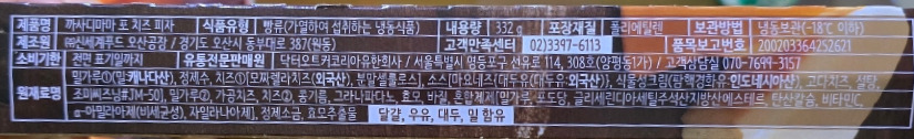 밀가루①(밀:캐나다산), 정제수, 치즈① 17.33%[모짜렐라치즈(외국산) 99%,분말셀룰로스], 소스 17.32%[마요네즈{대두유(대두유:외국산)}, 식물성크림(팜핵경화유:인도네시아산), 고다치즈 6%(고다치즈 99.3%), 설탕, 조미씨즈닝#JM-50], 밀가루②, 가공치즈 2.97%(모짜렐라치즈 60%, 고다치즈 19%, 그뤼에르치즈 0.09%), 치즈② 2.47%(고다치즈 99%), 콩기름, 그라나파다노, 효모, 바질, 혼합제제[밀가루, 포도당, 글리세린디아세틸주석산지방산에스테르, 탄산칼슘, 비타민C, α-아밀라아제(비세균성), 자일라나아제], 정제소금, 효모추출물 + 소스{가공치즈 3%(체다치즈 82%), 고르곤졸라치즈 1%}, 그라나 파다노 1.23% |